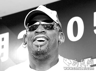 七分鐘后,前NBA巨星羅德曼出現(xiàn)在人們的視野里。他顯得有些疲倦,白色球帽遮住了那大半個(gè)五顏六色的后腦勺,不過(guò)那張有些冷酷的臉,還是讓人很快認(rèn)出,這就是那個(gè)我行我素的“大蟲(chóng)”羅德曼。