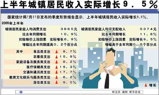 國家統(tǒng)計(jì)局進(jìn)行的抽樣調(diào)查顯示,上半年城鎮(zhèn)居民家庭人均可支配收入為5374元,比去年同期增長11.6%,扣除物價上漲因素,實(shí)際增長9.5%,增幅高于去年同期0.8個百分點(diǎn)。