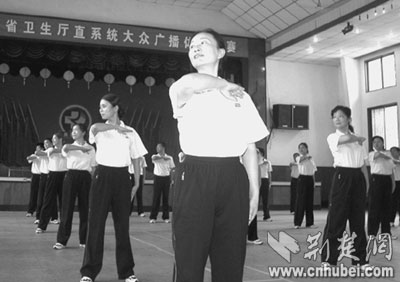 昨日下午,湖北省衛(wèi)生系統(tǒng)直屬11家醫(yī)院派出代表隊(duì),參加全省舉辦的第九套廣播體操比賽。據(jù)介紹,新體操在傳統(tǒng)廣播體操的基礎(chǔ)上,引入了武術(shù)、踢毽等元素,可有利促進(jìn)全身循環(huán)、精神傳導(dǎo)等。圖為省腫瘤醫(yī)院代表隊(duì)在表演。