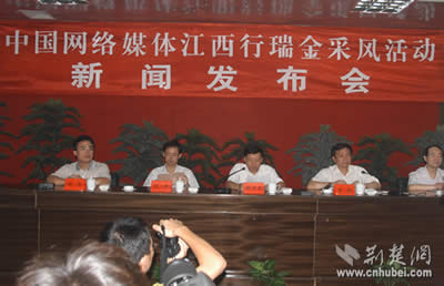 荊楚網(wǎng)消息 記者姚啟慧報(bào)道:12日晚,第二屆中國網(wǎng)絡(luò)媒體江西行采訪團(tuán)抵達(dá)共和國搖籃瑞金。13日上午,瑞金市舉行隆重的記者招待會(huì),瑞金市委書記肖毅親自向采訪團(tuán)記者推介紅色故都瑞金,市長楊中茂主持會(huì)議。