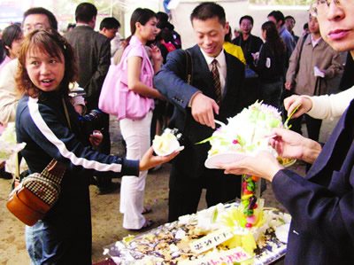這個匠心獨(dú)運(yùn)的蛋糕由妞妞公司制作贈送。其主體部分是一條飛龍,并書有“飛龍?jiān)谔臁弊謽。飛龍一側(cè),則是一只“神舟六號”航天飛船模型。