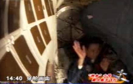 航天員準備穿越軌道艙(來源于CCTV)航天員進入軌道艙(來源于CCTV)航天員正穿越軌道艙(來源于CCTV) 航天員穿越軌道艙(來源于CCTV)