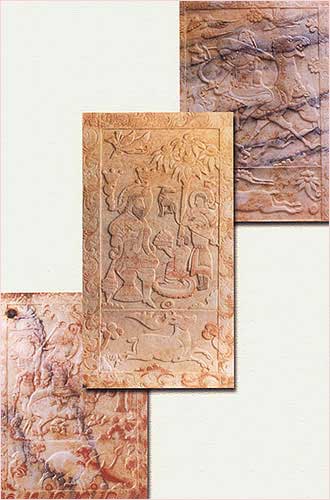石槨壁上主仆三人休息場面浮雕:(中,高96厘米,寬52厘米)