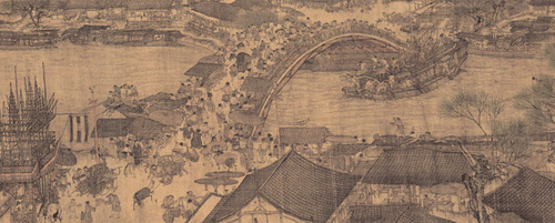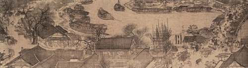 北宋京城汴梁及汴河兩岸的繁華和熱鬧的景象和優(yōu)美的自然風(fēng)光。作品以長卷形式,采用散點(diǎn)透視的構(gòu)圖法,將繁雜的景物納入統(tǒng)一而富于變化的畫卷中,畫中人物500多人,衣著不同,神情各異,栩栩如生,其間還穿插各種活動,注重情節(jié),構(gòu)圖疏密有致,富有節(jié)奏感和韻律的變化,筆墨章法都很巧妙,頗見功底。
