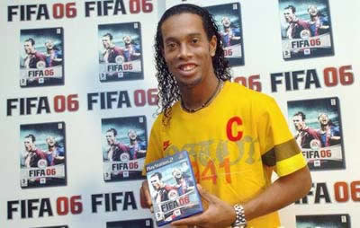 2005年10月20日,著名球星羅納爾迪尼奧在巴塞羅那為新款PS2足球游戲做宣傳。(華奧星空)