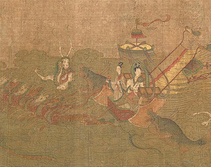 此圖是根據(jù)三國(220--265年)魏人曹植所寫《洛神賦》而創(chuàng)作的故事畫。畫面開首描繪曹植在洛水河邊與洛水女神瞬間相逢的情景,曹植步履趨前,遠望龍鴻飛舞,一位“肩若削成,腰如約素”、“云髻峨峨,修眉聯(lián)娟”的洛水女神飄飄而來,而又時隱時現(xiàn),忽往忽來。后段畫洛神駕六龍云車離去,玉鸞、文魚、鯨鯢等相伴左右,洛神回首張望,依依不舍,一種無奈離析之情顯現(xiàn)畫面。