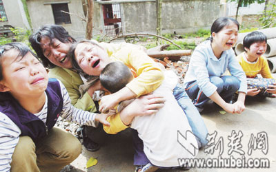 昨日上午,余行洲的妻子和5個(gè)兒女在其摔死的地方大聲慟哭,痛不欲生。當(dāng)?shù)鼐用窠榻B:余系黃陂李集人,一家人的生活全靠他在外打工維持。