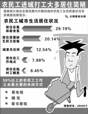 此外,農(nóng)民工生活質(zhì)量普遍不高。首先是農(nóng)民工生活、衛(wèi)生條件差。受工資水平低限制,大部分農(nóng)民工的月消費(fèi)幾乎全部用于住宿和食品消費(fèi),而在生病時(shí),只有少數(shù)人會(huì)選擇去正規(guī)醫(yī)院,其他人大都選擇自己買藥治療或去個(gè)體診所。其次是居住環(huán)境質(zhì)量差。近40%的農(nóng)民工居住在工棚或集體宿舍里,地方狹窄擁擠,室內(nèi)骯臟零亂,除了被褥衣物,幾無(wú)他物。