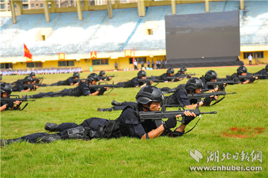 在警務(wù)技能演練之后,武警支隊(duì)、特警支隊(duì)和赤壁市公安局等單位60名民警,進(jìn)行了反暴恐合成作戰(zhàn)演練:公交車上制服歹徒、排爆員移除可疑爆炸物、狙擊手制服恐怖分子、談判專家現(xiàn)場喊話確保人質(zhì)安全……短短10多分鐘,各警種精誠合作,成功處置一起暴恐事件。隨后,民警和消防官兵又先后進(jìn)行了重大交通火災(zāi)事故救援處置、突發(fā)事件應(yīng)急處置綜合演練。