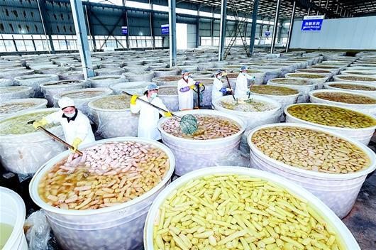 湖北日?qǐng)?bào)訊 眼下,正值蓮藕收獲季節(jié)。位于嘉魚縣陸溪鎮(zhèn)的嘉珍生態(tài)農(nóng)業(yè)發(fā)展有限公司車間內(nèi),工人們正在開封、準(zhǔn)備啟運(yùn)泡制的蓮藕產(chǎn)品。2012年嘉魚珍湖蓮藕登上《舌尖上的中國(guó)》后名聲大噪,國(guó)家質(zhì)檢總局近日正式批準(zhǔn)“嘉魚蓮藕”為國(guó)家地理標(biāo)志保護(hù)產(chǎn)品。目前,嘉魚縣每年生產(chǎn)蓮藕、蓮子和藕帶6萬多噸,產(chǎn)品銷往全國(guó)各地,并出口到歐美和東南亞等地區(qū)。(記者 陳勇 視界網(wǎng) 龍鈺 攝)