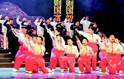 朗誦中有愛國情。“祝福你,親愛的祖國,為你唱首祝福的歌。你看那藍藍的天上,鳴放著一群白鴿……”《祝福你親愛的祖國》《國歌頌》且歌且誦,表現(xiàn)了咸寧青少年愛國愛黨的一片赤誠之心。
