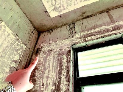 劉女士介紹,樓板有多處裂縫,有幾處水泥塊已掉,客廳后門(mén)的過(guò)梁有貫穿裂縫,還有幾處梁柱有裂縫,并且房子還是斜的。