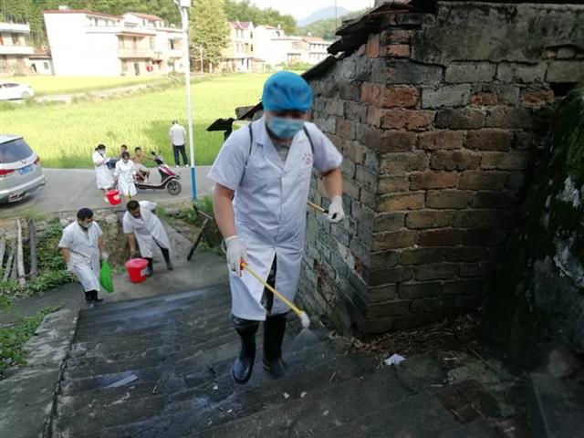 衛(wèi)生部門(mén)進(jìn)村灣對(duì)農(nóng)戶房前屋后進(jìn)行消殺,凈化環(huán)境。(胡劍芳攝)
