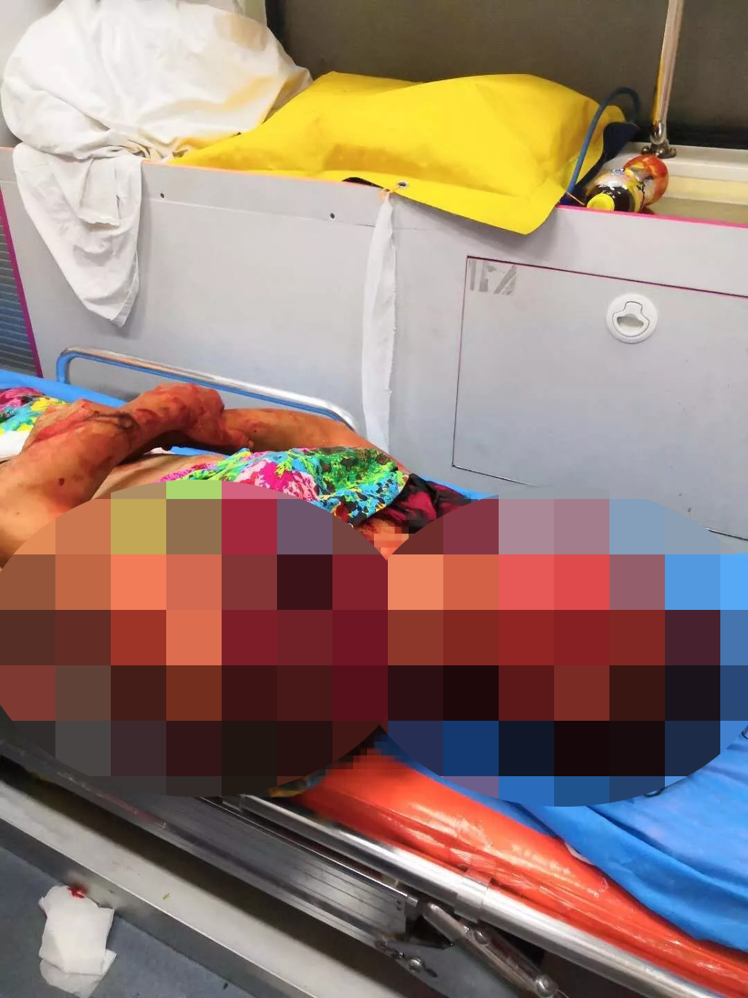被狗咬傷的婆婆倒在地上,渾身是傷,婆婆的頭被咬破多處,衣服褲子被撕爛,鞋子也被扯掉,渾身是血。