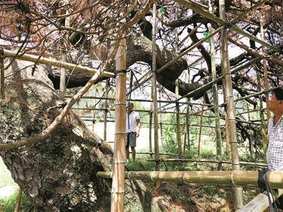 有村民翻出楊家族譜,上有清代進(jìn)士楊保田于光緒三十四年為這棵樹(shù)寫(xiě)的詩(shī):蒼蒼盤(pán)郁萬(wàn)年松,一種菁華虎膝鐘;鬼影婆娑園大蓋,虬枝屈曲蔭全宗;煙云繞干龍鱗老,風(fēng)雨鳴濤鶴夢(mèng)濃;每值歲寒貞晚節(jié),芳心何受大夫封?!斑@棵樹(shù)就是我們村灣的不老標(biāo)志!”在外經(jīng)商的村民楊財(cái)義拿出一張發(fā)黃的照片說(shuō),臥龍古松看著他們長(zhǎng)大,承載著他們童年的記憶,他們?cè)黄鹪跇?shù)上玩耍,偷吃父輩們曬的花生。夏夜坐在樹(shù)底下,聽(tīng)大人講五湖四海的故事。如今在外闖蕩,拖著疲憊身體回來(lái),到樹(shù)下走一走,心中愁緒一掃而空?!罢l(shuí)能救活這棵樹(shù),我們捐款打賞!”上楊灣的微信群里,每天都有村民詢(xún)問(wèn)樹(shù)的狀況??粗鴺?shù)葉日益變黃,村民們無(wú)不焦心,最后一致提議,只要有人能救活樹(shù),全村人將共同捐款打賞這位能人。