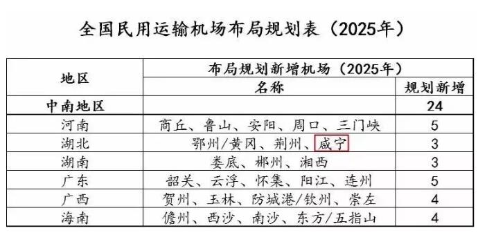 此前發(fā)布的《中國民用航空發(fā)展第十三個五年規(guī)劃》中,湖北省有兩個新建機場項目,分別是荊州、鄂州/黃岡機場,此次,咸寧機場成功擠入支線機場建設(shè)規(guī)劃。