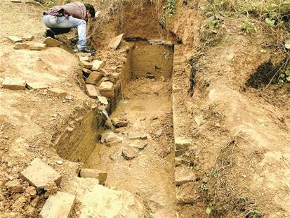 昨日上午,楚天都市報(bào)記者驅(qū)車來到該村,被盜的古墓離孫師傅家約有1公里路程,他帶著記者翻山來到現(xiàn)場。記者現(xiàn)場看到,該墓在一條公路邊上,墓穴已被挖開,長約3米,寬約70厘米,墓室由青磚砌成。青磚比普通磚要薄,有的青磚上還有花紋。