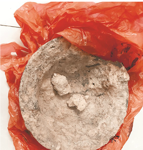 孫師傅說,當(dāng)村民趕過去的時(shí)候,墓穴已被挖開,不少周邊村民都前來圍觀,有人還在墓穴周圍找到了一些銅錢。他們當(dāng)即報(bào)警,當(dāng)日下午,崇陽縣博物館館長匡文、金塘派出所刑偵人員趕到現(xiàn)場進(jìn)行了勘查。據(jù)目擊村民介紹,盜挖古墓的是該村的宋某和退休人員盧某,共挖出了6件文物。當(dāng)天,在警方調(diào)查時(shí),宋某交出了一個(gè)破罐、一個(gè)鐵器等物件。