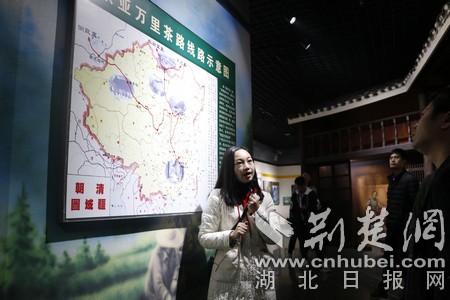 金牌講解員正在向采風(fēng)團(tuán)成員講解萬(wàn)里茶道路線(xiàn)。(采訪(fǎng)團(tuán)成員供圖)