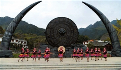 大坪鄉(xiāng)內(nèi)沖村村民在遙望千年廣場(chǎng)表演拍打舞