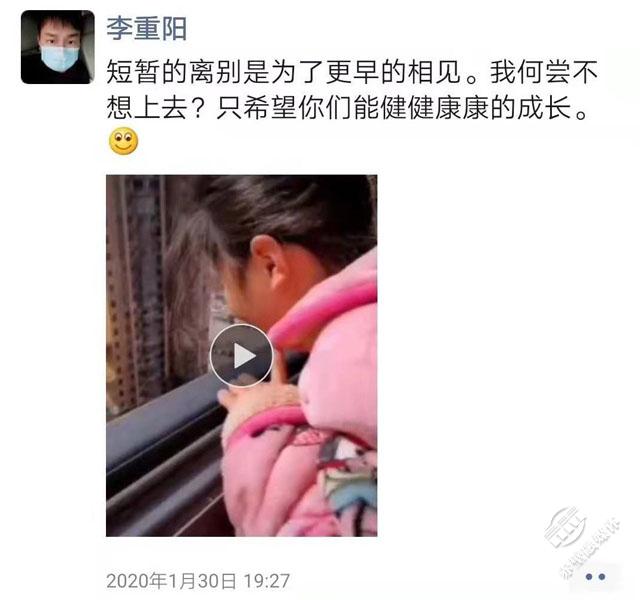 李重陽是中心消殺隊伍中的一員,1月29日,正值大年初五,已經近10天沒回家的他接到了到自己所住小區(qū)開展消殺工作的任務。所有工作完成后,他只能在樓下?lián)芡ㄒ曨l,遠遠的看了一眼妻子,聽著兒女叫了一聲“爸爸”。當天,李重陽發(fā)了這樣一條朋友圈:“短暫的離別是為了更早的相見。我何嘗不想上去?只希望你們能健健康康的成長?!崩钪仃栔皇浅啾诩部乇姸嗄贻p消殺隊員的一個代表。很多人無聊的“家”,正是他們一線疫情防控人員想回卻回不去的“家”。