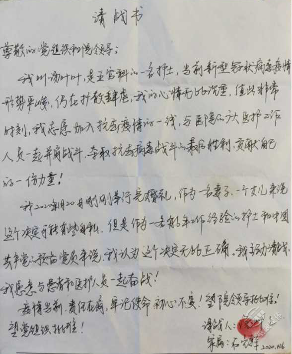 剛剛新婚,主動(dòng)放棄婚假,遞交請戰(zhàn)書,請求奔赴抗疫前線,貢獻(xiàn)自己的一份力。市人民醫(yī)院預(yù)備黨員、護(hù)士湯葉葉在請戰(zhàn)書中這樣寫道:“疫情當(dāng)前,責(zé)任在肩,牢記使命,初心不變!”
