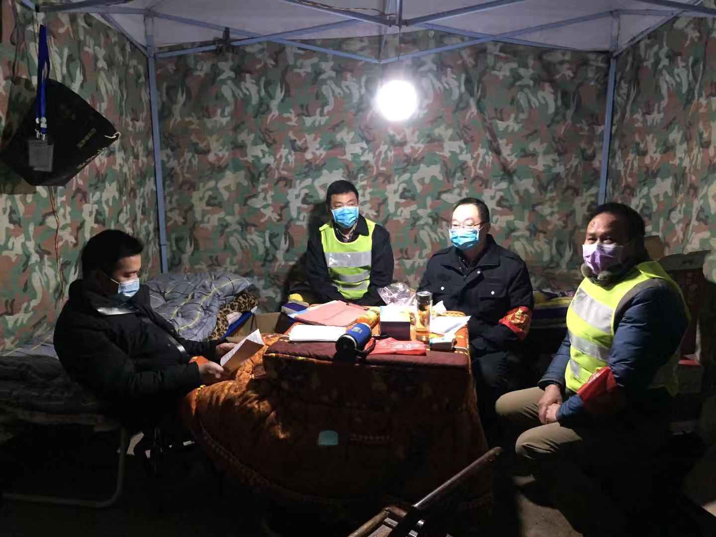 義源村的另一處臨時關(guān)卡點,16名黨員干部憑著幾把凳子,幾床被褥堅守陣 地,從1月25日開始, 24小時輪班執(zhí)勤,對外來人員車輛進(jìn)行勸返消毒,嚴(yán)防死守, 為全村疫情防控工作構(gòu)筑了一道牢固的安全網(wǎng)、防護(hù)欄。