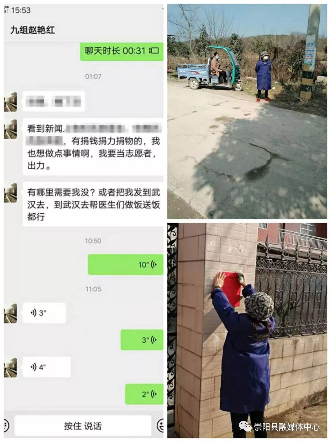 “有哪里需要我嗎?我要當(dāng)志愿者,哪怕是到武漢去為醫(yī)生做飯送飯都行。”這是青山鎮(zhèn)城萬村九組村民趙艷紅2月2日凌晨1點(diǎn),向村婦聯(lián)主席發(fā)出的“請(qǐng)戰(zhàn)”信息。