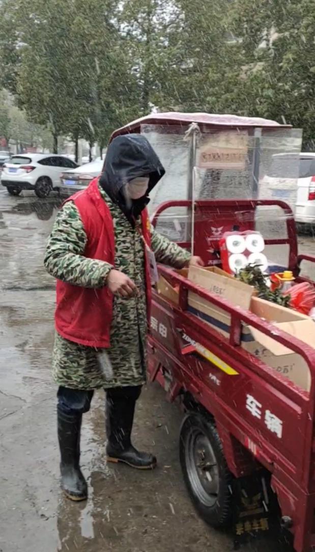 何正武負(fù)責(zé)整個(gè)小區(qū)生活保障物資配送、廣播宣傳巡查、樓棟排查。15日,他為20多戶居民送來(lái)訂購(gòu)的菜,風(fēng)雪中,他在門衛(wèi)足足等了兩個(gè)多小時(shí),最后只等來(lái)了三位居民前來(lái)拿走預(yù)訂的菜。盡管如此,他還是一如既往,做好物資配送等各項(xiàng)工作。