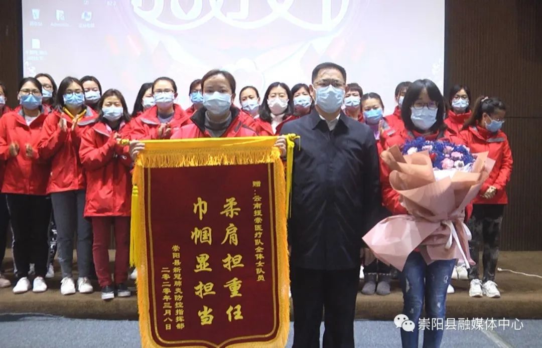 活動中,縣委副書記、縣長鄭俊華向云南援崇醫(yī)療隊(duì)贈授“柔肩擔(dān)重任·巾幗顯擔(dān)當(dāng)”感謝錦旗,縣委副書記、縣委政法委書記程冰野為崇陽縣人民醫(yī)院授予“巾幗建功集體”榮譽(yù)錦旗,同時,向每一位云南援崇醫(yī)療隊(duì)女醫(yī)護(hù)人員和奮戰(zhàn)在戰(zhàn)“疫”最前線的女醫(yī)生、女護(hù)士代表送上了鮮花和節(jié)日禮物。