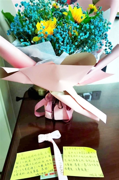 自稱為“云南小姐姐”的萬(wàn)麗萍,將一束開(kāi)得正艷的花和兩張小紙條擺在桌上。“玉哥,我怕分別時(shí)的淚崩,給你留了小紙條。咸寧的55天,感謝你無(wú)微不至的照顧,把我們一個(gè)個(gè)養(yǎng)得胖了一大圈。雖然回去要減肥,還是感恩、感謝!”