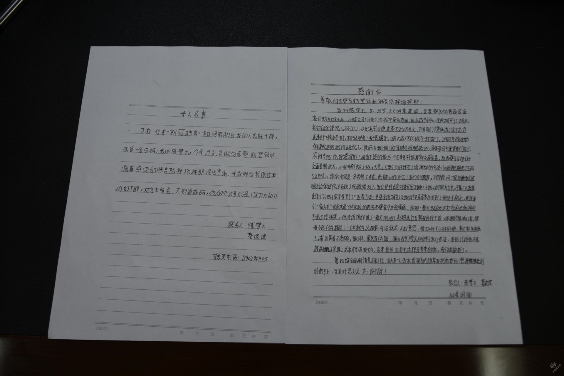 夫妻二人一直對(duì)這位胡姓同志十分感激,2月18日,陳夢(mèng)云給市疫情防控指揮部寫(xiě)了一封感謝信,同時(shí)希望他們能幫忙找到那位胡姓同志以便表示感謝。經(jīng)過(guò)一個(gè)半月的尋找,4月6日,夫妻二人終于得知——胡明浩,市衛(wèi)健局人事股科員,于是給其所在市新冠肺炎疫情防控指揮部送上錦旗。