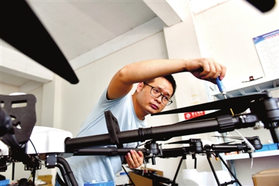 8月10日,咸安鳳凰工業(yè)園天意模型科技公司總經(jīng)理陳克朋正在組裝農(nóng)業(yè)植保無(wú)人機(jī)。