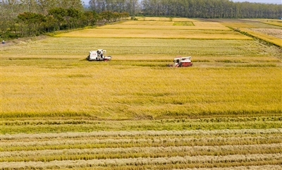 13日,嘉魚(yú)簰洲灣田野一片金黃,40000多畝晚稻田里,幾十臺(tái)收割機(jī)、運(yùn)輸車(chē)一片忙碌。