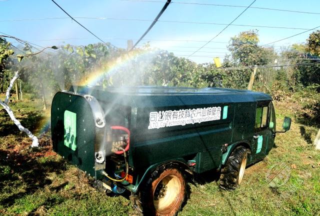 “一輛植保車輕輕松松一小時(shí)噴灑作業(yè)可以達(dá)到25畝以上,這是人工一天‘拉了瓦’也到達(dá)不了的的作業(yè)量?!?1月12日,在神山興農(nóng)公司位于官塘驛鎮(zhèn)御屏山村的半島獼猴桃基地,熊堃坐進(jìn)1.5米身高的袖珍新能源植保車,拉動手閘,轉(zhuǎn)動方向盤,一番操作后,通過7條噴孔噴出的霧狀藥液在陽光下形成一道彩虹。