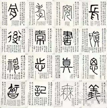 在創(chuàng)作中,陳履生用接近現(xiàn)代繪畫的方式,將字的主體以篆書寫在中心位置,周圍以行書題跋書寫注釋、個(gè)人感悟等相關(guān)內(nèi)容,強(qiáng)化對這個(gè)字的認(rèn)識過程,讓人有更深刻的理解。如開篇第二字“義”字的題跋,除了引用古籍中對義字的解讀,還加入了一句“時(shí)在國家多事之時(shí),義士善舉皆多”的感悟,與當(dāng)時(shí)“大疫當(dāng)前有大義”的情境十分貼合。