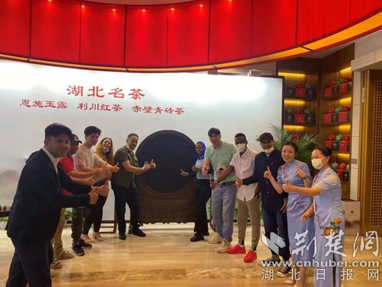 圖為在重達(dá)100多斤的赤壁青磚茶工藝品擺件前,國際友人一起合影留念。(通訊員供圖)