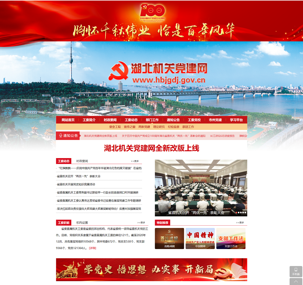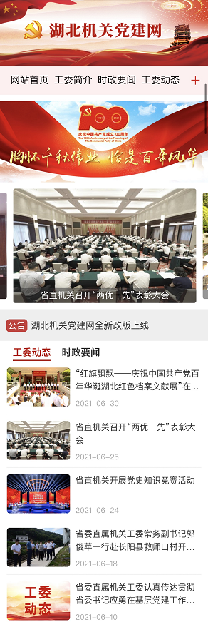 荊楚網(wǎng)(湖北日報(bào)網(wǎng))訊(記者謝頤 通訊員鄭羽嬋)在中國共產(chǎn)黨成立100周年之際,湖北機(jī)關(guān)黨建門戶網(wǎng)站湖北機(jī)關(guān)黨建網(wǎng)(http://www.hbjgdj.gov.cn/)電腦端、移動端全新改版上線。這是省委直屬機(jī)關(guān)工委積極探索智慧黨建的有效途徑,是加強(qiáng)省直機(jī)關(guān)黨建宣傳工作的重要舉措,是為黨慶生、為黨祝福獻(xiàn)上的特殊禮物。