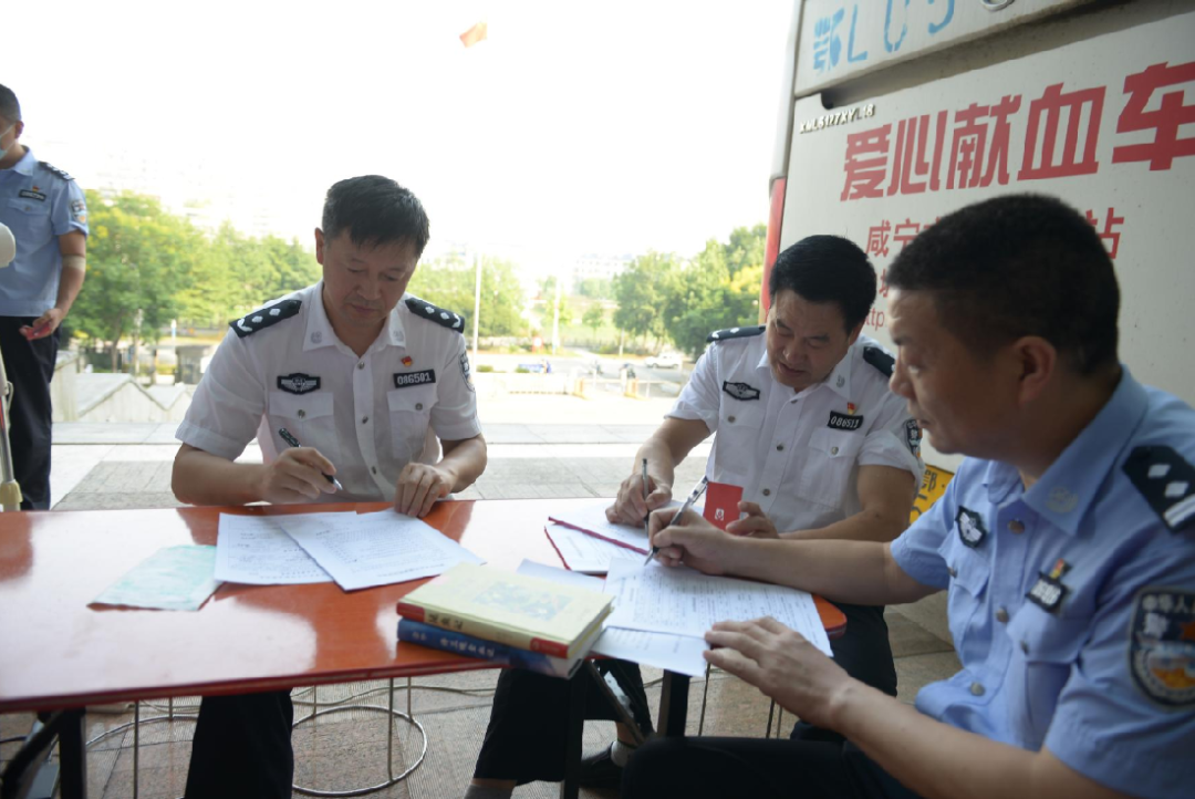 在咸寧公安主樓門廊中,聞?dòng)嵹s來(lái)的民輔警整齊列隊(duì),按照醫(yī)務(wù)人員的指引,依次進(jìn)行信息登記、血液檢查、靜脈采血。有多次參加獻(xiàn)血的“金獎(jiǎng)老將”,也有初次上陣的“警營(yíng)新兵”,還有尚在見習(xí)期的“學(xué)警新秀”。心照不宣的接力,在新老交織中流淌、賡續(xù)、傳承,匯聚起愛的暖流!