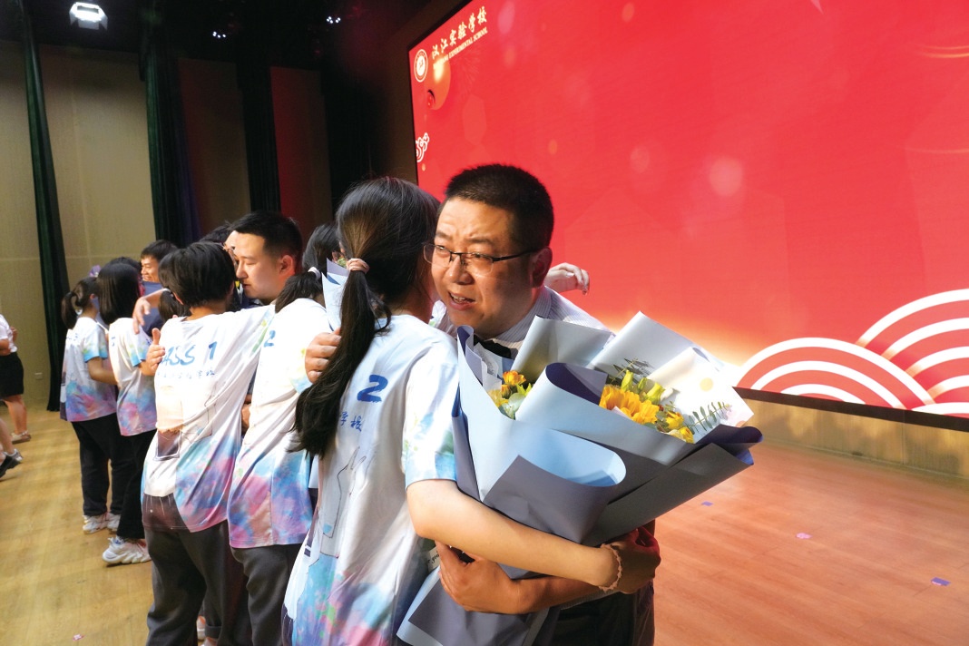 6月17日,漢江實驗學校舉行“傳承榮光·感恩母校”2022屆九年級畢業(yè)典禮,為即將參加中考的學子們加油鼓勁。圖為學生與老師擁抱,表達感激之情。圖/通訊員 涂銀玥 鮑玉
