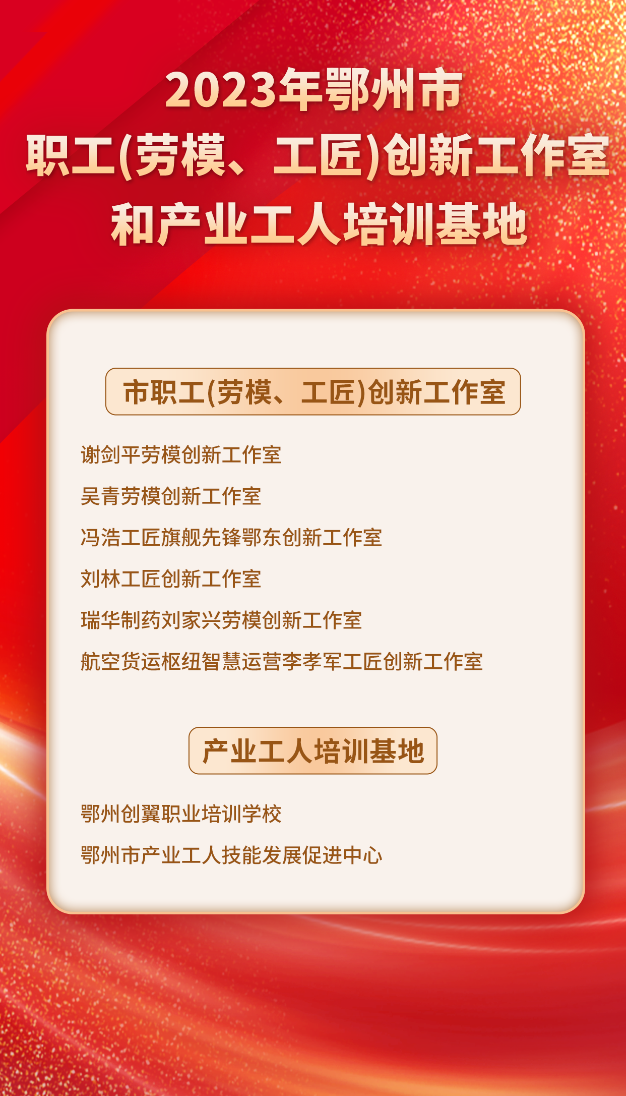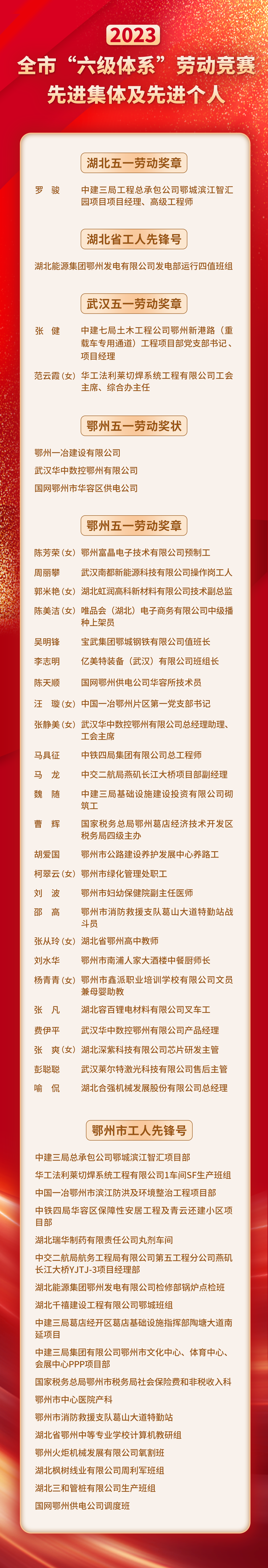 4月22日上午,在2024年鄂州市雙“百千萬”勞動和技能競賽啟動式上,鄂州公布2023年全市“六級體系”勞動競賽先進(jìn)集體及先進(jìn)個人名單,并公布2023年鄂州市職工(勞模、工匠)創(chuàng)新工作室和產(chǎn)業(yè)工人培訓(xùn)基地。