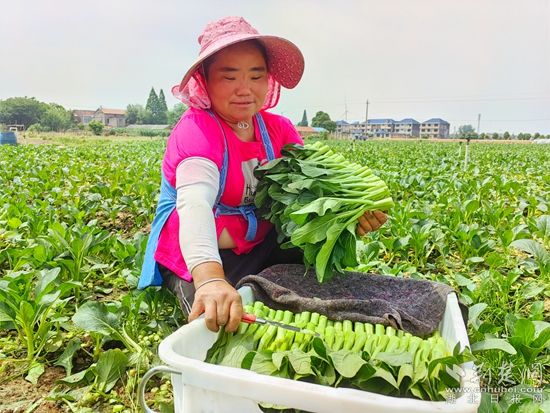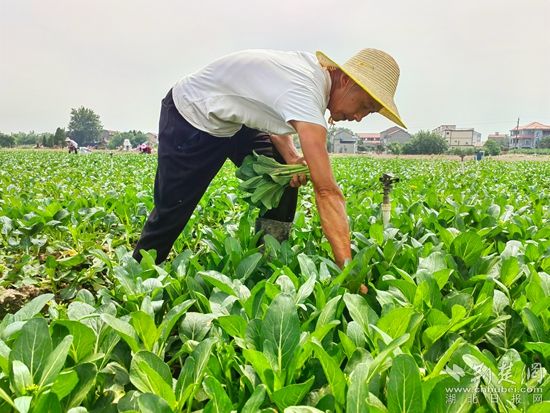 在黃梅縣分路鎮(zhèn)鼎旺農業(yè)農民專業(yè)合作社廣東菜心種植基地,近100名割菜工手戴指甲刀,在技術顧問呂美標的指揮下,分散到各個地塊,不一會兒,路兩旁就整齊堆滿了菜心,合作社社長石成旺拿出手機聯(lián)系車輛,經過整理、清洗,剛收割的菜心就被送到凍庫,準備第二天運往國內外。