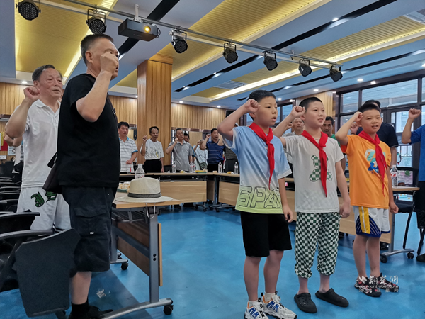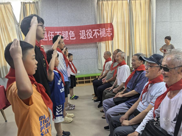 少年興則國家興,少年強則國家強。歐景苑社區(qū)開展“薪火傳承鑄軍魂,老少同堂慶八一”主題活動,青少年們與退役軍人歡聚一堂,共同觀看了紀(jì)錄片《為了和平》。少先隊員為退役老兵們系上鮮艷的紅領(lǐng)巾,并敬上隊禮。退役老兵代表戴三善分享了自己的從軍經(jīng)歷,孩子們聚精會神地聆聽著,心中升起對參軍的憧憬。