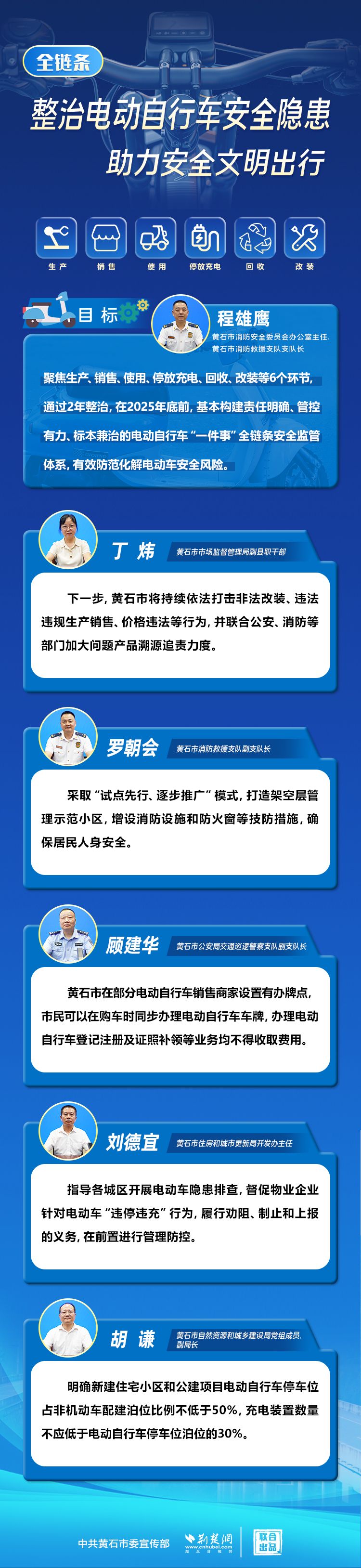荊楚網(wǎng)(湖北日報(bào)網(wǎng))訊(記者 劉璐 通訊員 李玉)8月15日,黃石召開新聞發(fā)布會(huì),通報(bào)全市電動(dòng)自行車安全隱患全鏈條整治行動(dòng)總體情況。會(huì)上提出,在2025年底前,基本構(gòu)建責(zé)任明確、管控有力、標(biāo)本兼治的電動(dòng)自行車“一件事”全鏈條安全監(jiān)管體系。
