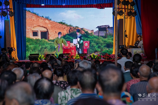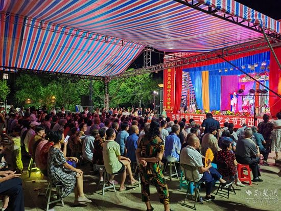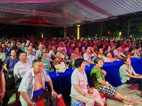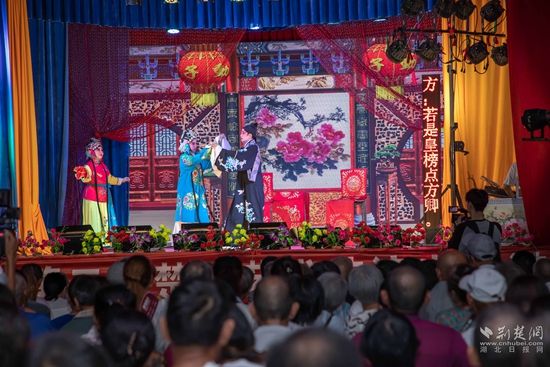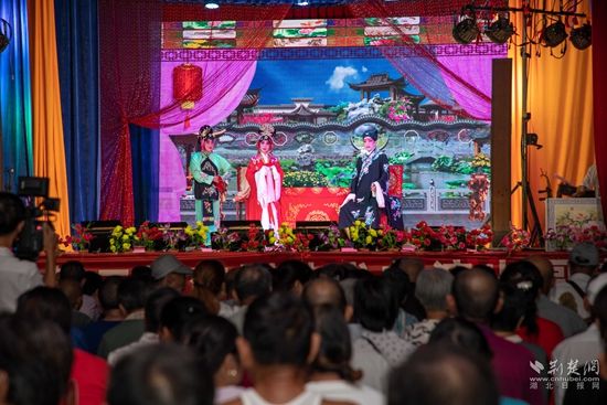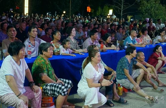 當(dāng)晚7點(diǎn),廣場上人聲鼎沸、鑼鼓喧天、座無虛席,來自周邊村鎮(zhèn)的老百姓偕老扶幼聚集于此,共襄楚劇盛會(huì)。
