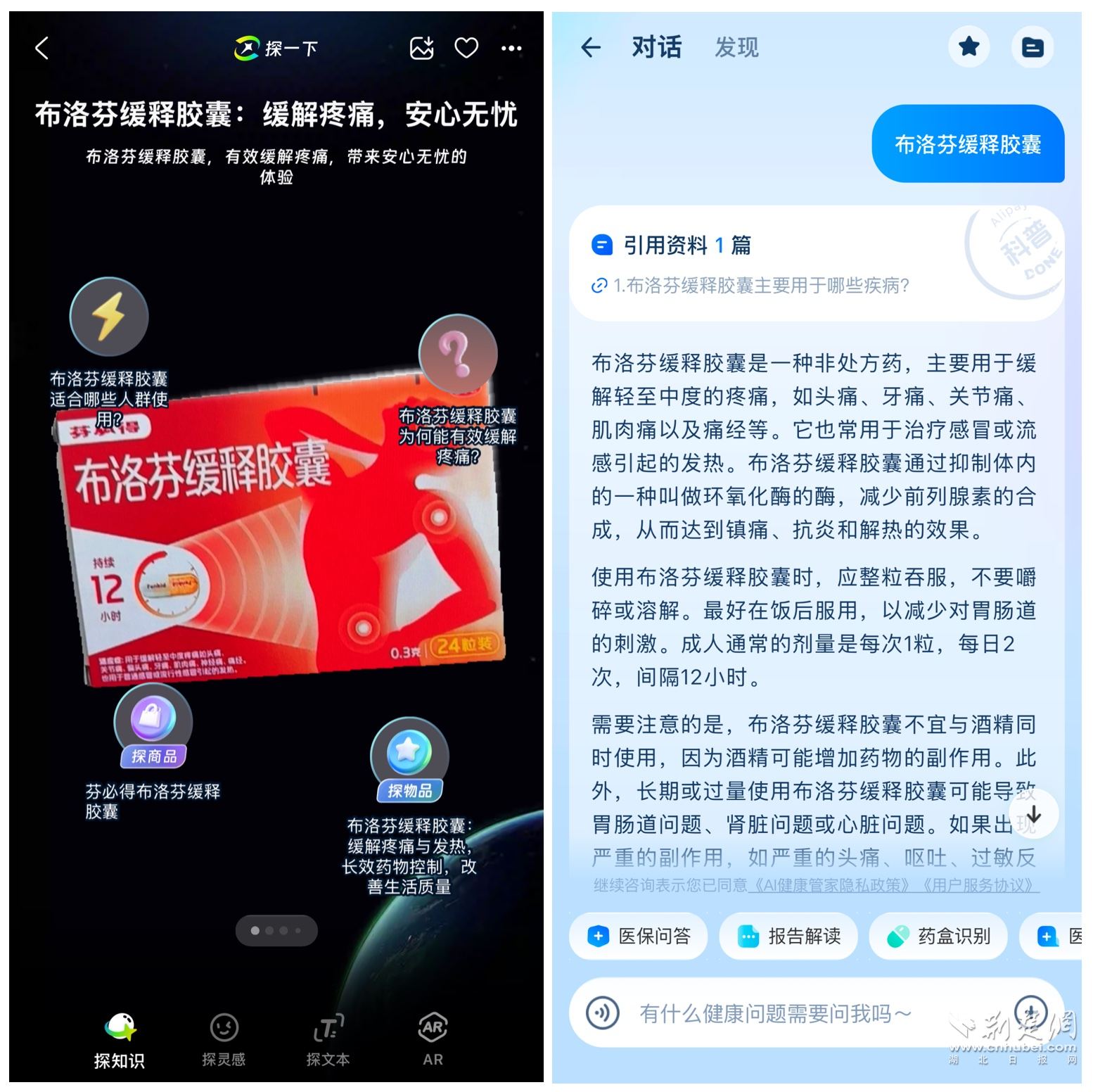 遇到讀不懂的外文商品,探一下就能獲取詳情,更方便線上買同款;家里丟了說明書的藥盒,不僅可查到詳細介紹,還能調(diào)用支付寶旗下“AI健康管家”追問更多的用藥須知。