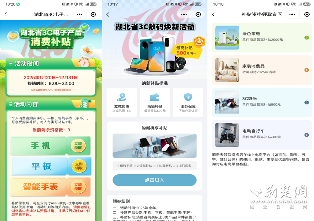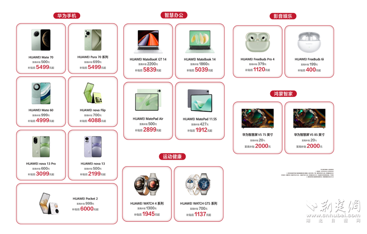 荊楚網(wǎng)(湖北日報(bào)網(wǎng))訊 (通訊員 高洋)2025年1月20日,“國補(bǔ)”政策首次擴(kuò)圍至消費(fèi)電子行業(yè)。對個(gè)人消費(fèi)者購買華為手機(jī)、平板、智能手表手環(huán)等3類數(shù)碼產(chǎn)品(單件銷售價(jià)格不超過6000元),按產(chǎn)品銷售價(jià)格的15%給予補(bǔ)貼,每位消費(fèi)者每類產(chǎn)品可補(bǔ)貼1件,每件補(bǔ)貼不超過500元。對于想要購買華為手機(jī)的消費(fèi)者來說,這波優(yōu)惠力度拉滿。