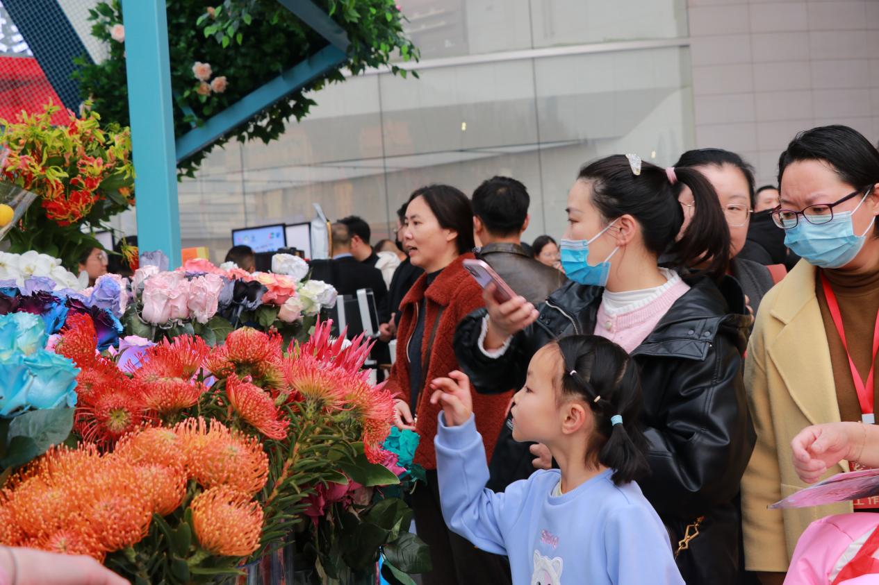 在鮮花區(qū),厄瓜多爾的玫瑰、坦桑尼亞的鐵線蓮、南非的紅帝王和針墊等遠道而來的花卉與來自荷蘭的丁香花、墨西哥的跳舞蘭以及云南、海南等地的香水百合、雛菊、轉運竹等花卉交相輝映,共同編織了一個五彩斑斕的花卉世界。