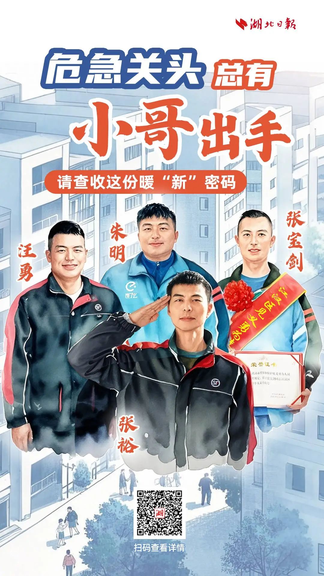 近些年來,人們發(fā)現(xiàn),這個(gè)群體不僅是物流網(wǎng)絡(luò)的末梢神經(jīng),更成為群眾安危的守護(hù)者。很多人都知道這些故事:杭州外賣騎手彭清林12米高橋縱身躍江救人,溫州快遞員羅天友救人之后悄然離開,無錫李鯤鵬憑借職業(yè)敏感識(shí)破詐騙包裹。很多人也熟悉武漢的這些名字:“最美快遞員”汪勇,“火場(chǎng)英雄”順豐小哥張?jiān)?,帶領(lǐng)居民撲火的騎手朱明,用攜帶的自動(dòng)體外除顫器開啟緊急救人的張寶劍。