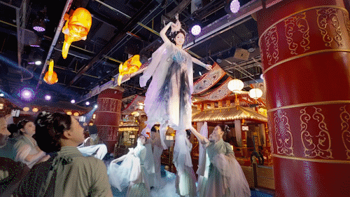 木蘭不夜城實(shí)景演繹、循環(huán)演出不間斷,噴火等絕技表演獲得了游客們的陣陣掌聲;《楚地長(zhǎng)歌》花魁、茶鋪掌柜、店小二、浣紗女NPC街頭“飆戲”,吸引了游客朋友們互動(dòng)打卡,人氣火爆。